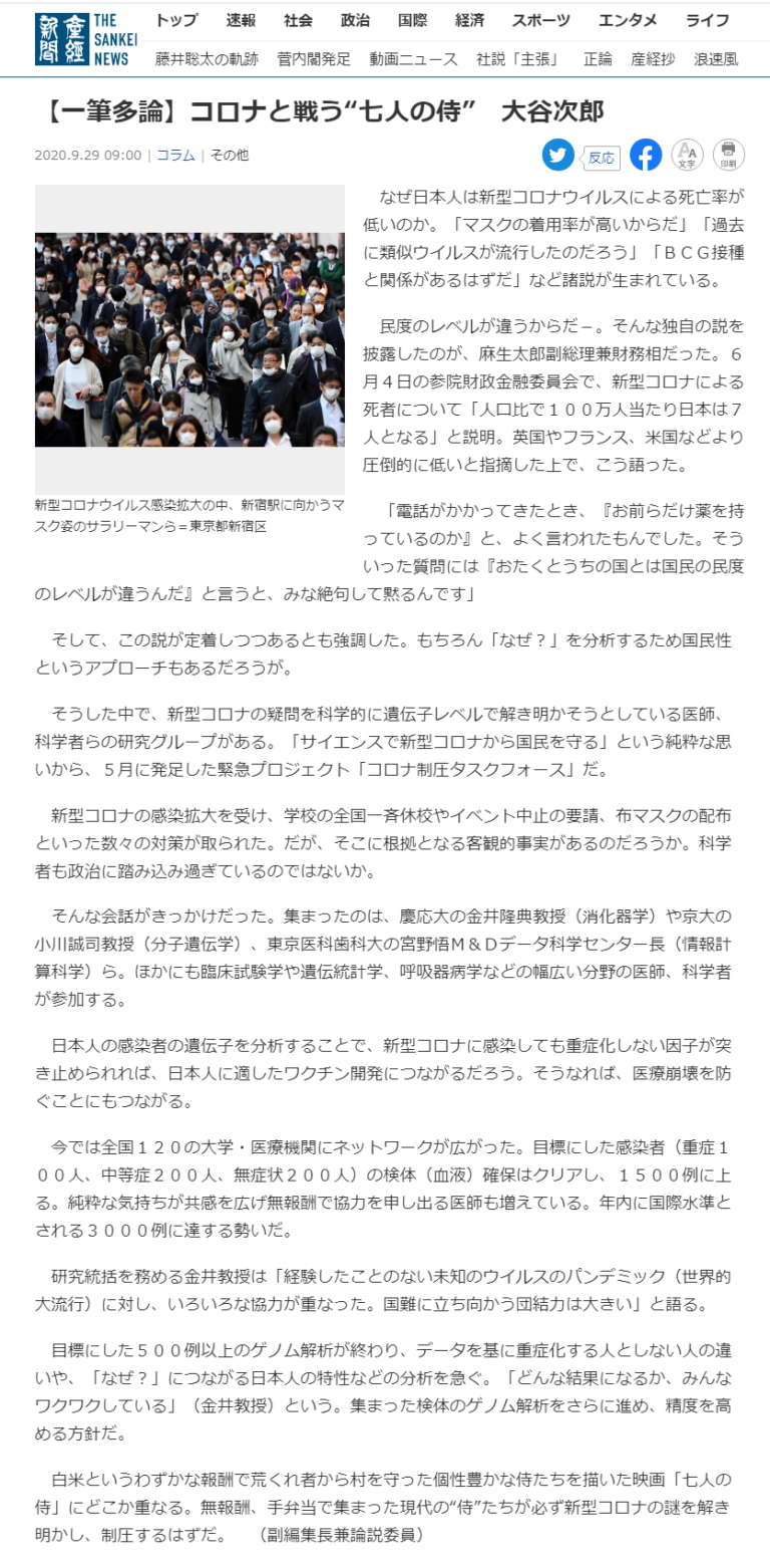2020年9月30日の産経新聞にて コロナ制圧タスクフォースの取り組んでる重症化遺伝子X特定に関する記事が掲載されました。 上がWEB版、下が紙面のPDFで掲載をしております。 紙面はこちらから