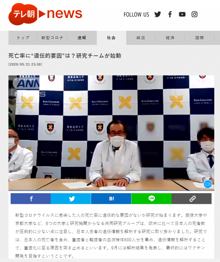 NHKニュースWEBにて2020年5月21日に掲載されました。 「新型コロナ 重症化に遺伝的要因は? 遺伝情報を分析へ」 https://www3.nhk.or.jp/news/html/20200521/k10012438401000.html
