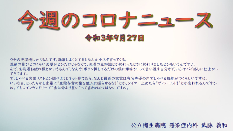 公立陶生病院 感染症内科の武藤義和先生が作成された 新型コロナウイルスに関する「今週のコロナニュース 令和3年9月27日」です。 今回は主にワクチンについての情報となります。 下の画像をクリックするとPDFが閲覧できます。