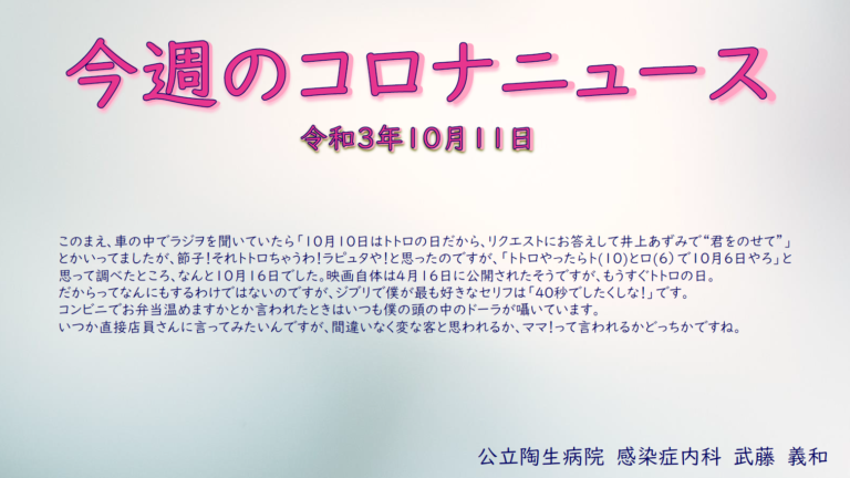 公立陶生病院 感染症内科の武藤義和先生が作成された 新型コロナウイルスに関する「今週のコロナニュース 令和3年10月11日」です。 下の画像をクリックするとPDFが閲覧できます。