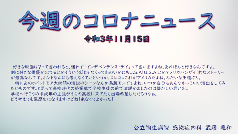 公立陶生病院 感染症内科の武藤義和先生が作成された 新型コロナウイルスに関する「今週のコロナニュース 令和3年11月15日」です。 下の画像をクリックするとPDFが閲覧できます。