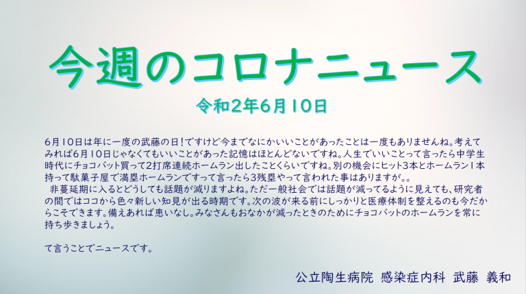 公立陶生病院 感染症内科の武藤義和先生が作成された 新型コロナウイルスに関する「今週のコロナニュース」です。 下の画像をクリックするとPDFが閲覧できます。